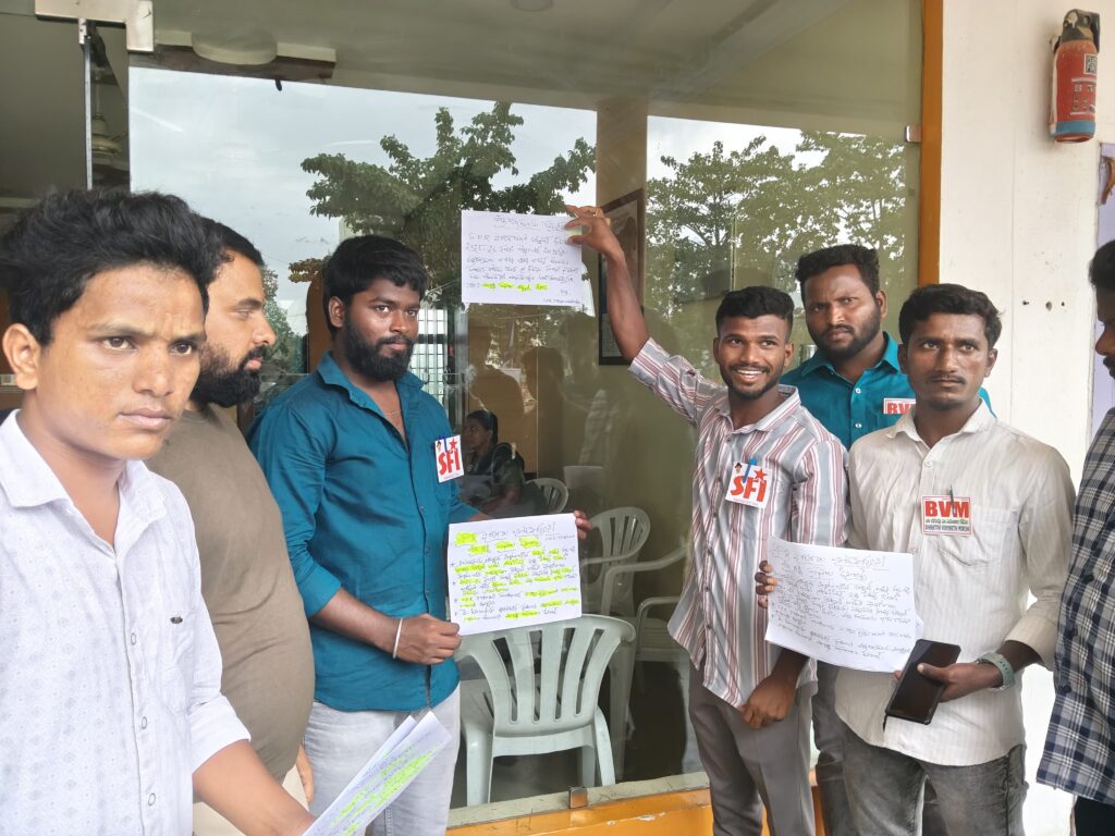 ఈ కార్యక్రమంలో ఎన్ ఎస్ యు ఐ జిల్లా అధ్యక్షులు ఐరెని సందీప్ కుమార్, బివిఎం రాష్ట్ర కార్యదర్శి జీవియం విఠల్, ఎస్ ఎఫ్ ఐ జిల్లా కార్యదర్శి అరుణ్ కుమార్,యశ్వంత్,బులెట్, స్టాలిన్,అందుకుల అనిల్,శ్యామ్ టీంకు, సూఫీయాన్, శ్యామ్ తదితరులు పాల్గొన్నారు.