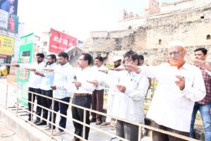 మాదక ద్రవ్యాల రహిత సమాజ స్థాపనలో ప్రతి ఒక్కరూ భాగస్వాములు కావాలని నగరపాలక సంస్థ కమిషనర్ పి.విశ్వనాథ్ తెలిపారు. మంగళవారం నషా ముక్త్ భారత్ అభియాన్ కార్యక్రమం భాగంగా కొండారెడ్డి బురుజు వద్ద ఉద్యోగులు, సిబ్బందితో మాదకద్రవ్య రహిత సమాజ నిర్మాణం కోసం ప్రతిజ్ఞ చేయించారు.