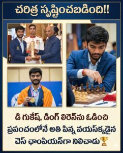 ప్రపంచ చదరంగం (చెస్) చరిత్రలోనే ఒక అద్భుతం జరిగింది. చైనాకు చెందిన డింగ్ లిరెన్ను ఓడించి, మన భారతీయ గ్రాండ్ మాస్టర్ డి. గుకేష్ ప్రపంచంలోనే అతి పిన్న వయస్కుడైన యంగెస్ట్ వరల్డ్ చెస్ ఛాంపియన్గా నిలిచాడు.