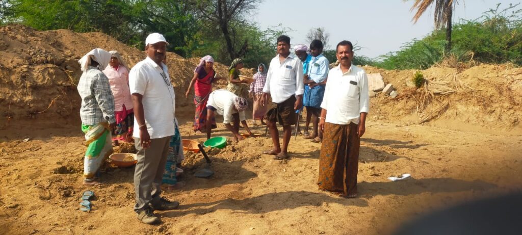 ఉపాధి హామీ పనులు కూలీల కు వరము లాంటివని అందువల్ల ఎవరు కూలీలు ఇతర ప్రాంతాలకు వలసలు వెళ్ళవద్దని స్థానికంగా కూలీలకు పనులు కల్పిస్తామని ఏపీఓ రామకృష్ణ యాదవ్ అన్నారు. మంగళవారం రామలింగయ్య పల్లె గ్రామంలో జరుగుతున్న ఉపాధి హామీ పనుల ను ఆయన తనిఖీ చేశారు. ఈ సందర్భంగా కూలీలతో ఆయన మాట్లాడుతూ కూలీలకు పనులు కల్పించేందుకు కేంద్ర రాష్ట్ర ప్రభుత్వాలు ఉపాధి హామీ పనులను నిర్వహించడం జరుగుతుందన్నారు. అందువల్ల కూలీలు ఉదయాన్నే ఇంటి నుండి బయలుదేరి సకాలంలో పనులు చేసి తిరిగి వెళ్లాలని ఆయన తెలిపారు .సీనియర్ మేటీలు ఇచ్చిన కొలతల ప్రకారం పనులు చేస్తే ఒక్కొక్కరికి 270 రూపాయలు పైగా వేతనం వస్తుందని ఆయన తెలిపారు. అందువల్ల కూలీలు ఈ అవకాశాన్ని సద్వినియోగం చేసుకోవాలని ఆయన కోరారు. ఈ కార్యక్రమంలో జూనియర్ ఇంజనీర్ ప్రదీప్ ,ఫీల్డ్ అసిస్టెంట్ నాగేశ్వర్ రెడ్డి తదితరులు పాల్గొన్నారు.
