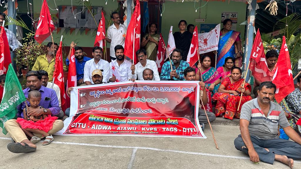 భద్రాద్రి కొత్తగూడెం జూన్ 23 అఖండ భూమి వెబ్ సైట్ : సిఐటియు,ఐద్వా,వ్యాకస,డివైఎఫ్ఐ,కెవిపిఎస్ సంఘాల ఆధ్వర్యంలోగృహలక్ష్మి పథకంలో ఐదు లక్షలు ఇంటికి మంజూరు చేయాలని ఇంటి స్థలాలు లేని వారికి ఇంటి స్థలాలు ఇవ్వాలని,పూర్తయిన డబల్ బెడ్ రూమ్ ఇళ్లను వెంటనే పంపిణీ చేయాలని,లక్ష రూపాయల బీసీ రుణాల దరఖాస్తుగడువు పెంచాలని తదితర డిమాండ్లతో శుక్రవారం భద్రాచలం పట్టణంలోని స్థానిక తాసిల్దార్ కార్యాలయం ముందు భారీ ధర్నా ప్రజా సంఘాల ఐక్యవేదిక ఆధ్వర్యంలో నిర్వహించడం జరిగినది.ఈ కార్యక్రమానికి సిఐటియు పట్టణ కన్వీనర్ ఎంబీ నర్సారెడ్డి అధ్యక్షతన జరిగినది.ఈ సందర్భంగా వికాస ఉపాధ్యక్షులు గడ్డం స్వామి,కోకన్వీనర్ ఎం రేణుక కార్యదర్శి డి లక్ష్మీ లు మాట్లాడుతూ రాష్ట్ర ప్రభుత్వం గత ఎన్నికల ముందు ఖాళీ స్థలాలు ఉన్నవారికి ఇంటి నిర్మాణానికి ఐదు లక్షల మంజూరు చేస్తామని,అదేవిధంగా అర్హులైన అందరికీ డబుల్ బెడ్ రూమ్ ఇల్లు నిర్మించేస్తామని,ఇంటి జాగాలు లేని వారికి స్థలాలు ఇస్తామని,అర్హులైన బీసీల అందరికీ లక్ష రూపాయలు ఆర్థిక సహాయం ఇస్తామని హామీ ఇచ్చి, గడిచిన ఐదేళ్ల కాలంలో భద్రాచల పట్టణంలో నిర్మించిన డబల్ బెడ్ రూమ్ ఇల్లు ఒక్కరికి కూడా పంపిణీ చేయలేదని, అలాగే గృహలక్ష్మి పథకానికి మూడు లక్షలు మాత్రమే ఇస్తామని ప్రకటించి దానిని గతంలో ప్రకటించిన ఐదు లక్షలు ఇచ్చే విధంగా ప్రభుత్వం చర్యలు తీసుకోవాలని,ఇంటి స్థలాలు లేని వారికి స్థలం కేటాయించి గృహలక్ష్మి పథకంలో ఇల్లు మంజూరు చేయాలని అలాగే ఇటీవల కాలంలో ప్రకటించిన అర్హులైన బీసీలకు లక్ష రూపాయలు ఆర్థిక సహాయం చేస్తామని ప్రకటించి ఈనెల 20వ తేదీతో గడువు ముగిసినందున దాని గడువు పెంచాలని కోరినారు.లేనియెడల పెద్ద ఎత్తున ప్రజలను సమీకరించి ఆందోళన ఉధృతం చేస్తామని హెచ్చరించారు.కేంద్ర ప్రభుత్వం ప్రధాని ఆవాస్ యోజన కింద ఒక్కో ఇంటికి 10 లక్షలు మంజూరు చేస్తామని చెప్పినందున తక్షణమే వాటిని మంజూరు చేయాలని కేంద్ర ప్రభుత్వాన్ని డిమాండ్ చేసినారు.కావున రెండు ప్రభుత్వాలు వచ్చిన చేసుకొని రేపు జరగబోయే ఎన్నికల్లో లోపు ప్రభుత్వాలు ఇచ్చిన హామీలను వెంటనే నెరవేర్చాలని డిమాండ్ చేసినారు.ఈ కార్యక్రమంలో ఐద్వా జిల్లా నాయకులు యూ జ్యోతి,యన్ లీలావతి,కే కుసుమ ,జీవనజ్యోతి,వనమ్మ ,సిఐటియు నాయకులు జిల్లా కమిటీ సభ్యులు ఎం నాగరాజు ,పి సంతోష్,లక్ష్మణ్ ,డి రామకృష్ణ ,వి రాము ,జాకీ,కాపుల రవి లు ప్రజాతంత్ర ఉద్యమ నాయకులు వై వెంకట రామారావు ,ఎస్ రామకృష్ణ,సిహెచ్ మాధవరావు ,గిరిజన సంఘం కార్యదర్శి శ్రీను విజయ,కె వి పి స్ జిల్లా నాయకులు కోరాడ శ్రీను చేగొంటి శ్రీను డివైఎఫ్ఐ పట్టణ అధ్యక్ష కార్యదర్శులు సతీష్ ప్రేమ్ కుమార్ ఎంబి నర్సారెడ్డి సీఐటీయూ కన్వీనర్ తదిత