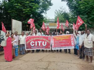 భవన నిర్మాణ కార్మికుల సంక్షేమ బోర్డు పునరుద్దించి సంక్షేమ పథకాలు అమలు చేయాలని కోటనందూరు మండలంలో షేక్ పద్మ సిఐటియు నాయకురాలు ఆధ్వర్యంలో భవనిర్మాణ కార్మికులు తహసిల్దార్ కార్యాలయం వద్ద ధర్నా చేయడం జరిగింది. కోటనందూరు సిఐటియు మండల కార్యదర్శి షేక్ పద్మ మాట్లాడుతూ భవన నిర్మాణ కార్మికుల సంక్షేమ బోర్డు పథకాలు పునరుద్దించాలని, సంక్షేమ బోర్డు సంక్షేమ పథకాలు అమలు కాకుండా రాష్ట్ర ప్రభుత్వం తీసుకొచ్చిన మెమో నెంబర్ 1214 రద్దు చేయాలని, నాలుగు సంవత్సరాల నుంచి పెండింగ్లో ఉన్న పరిహారాలను కార్మికులకు తక్షణమే చెల్లించాలని, కరోనా కారణంగా చనిపోయిన భవన నిర్మాణ కార్మికుల కుటుంబాలకు 10 లక్షలు చెల్లించాలని , వైయస్సార్సీపి ప్రభుత్వం పక్కదారి పట్టించిన కార్మికుల సిస్ నిధులు 240 కోట్లు తిరిగి సంక్షేమ బోర్డుకు చెల్లించాలని డిమాండ్ చేశారు. అనంతరం తహసిల్దార్ కు వినతిపత్రం ఇవ్వడం జరిగింది. ఈ కార్యక్రమంలో నూకరాజు, బొజ్జ, ఎం మాణిక్యం, పీ నాగేశ్వరావు, పీ శ్రీను,గడ్డం సమ్మయ, అప్పారావు, మల్ల కన్నబాబు, వేగీ రమణ, భూషణం ,ఈ సత్తిబాబు, నాగరాజు, కర్రీ సత్తిబాబు, తదితరులు పాల్గొన్నారు.