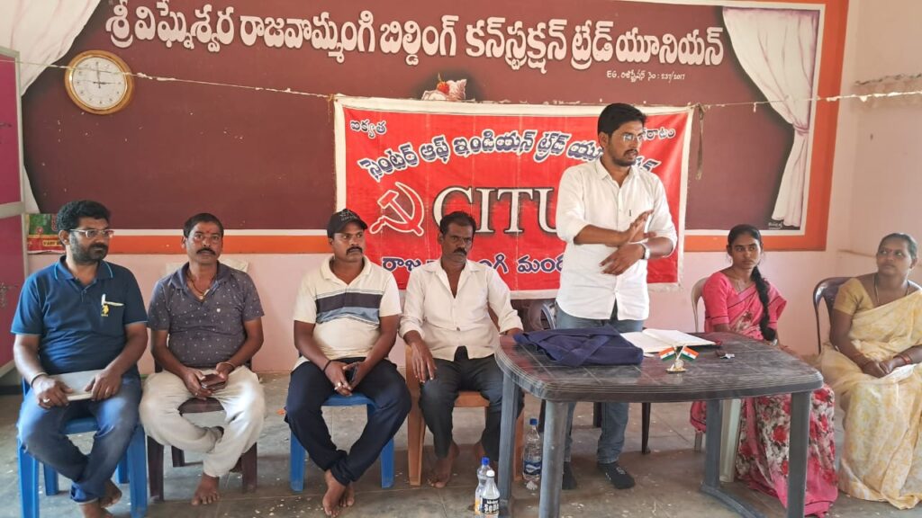సీఐటీయూ జిల్లా కార్యదర్శి పి వెంకట్. సమస్యల పరిష్కారం కోసం అన్ని వర్గాల రంగాల కార్మికులు ఐక్య పోరాటాలకు సిద్ధం కావాలని రంపచోడవరం సిఐటియు జిల్లాకార్యదర్శి పల్లపు వెంకట్ పిలుపునిచ్చారు, రాజవొమ్మంగిలో మంగళవారం తాపీ మేస్త్రీల సమావేశ మందిరంలో సిఐటియు మండల విస్తృతస్థాయి సమావేశం సిఐటియు జిల్లా ఉపాధ్యక్షులు పి రామరాజు అధ్యక్షతన జరిగింది,ఈ సమావేశాన్ని ముఖ్య అతిథిగా హాజరైన సిఐటియు జిల్లా ప్రధాన కార్యదర్శి పి వెంకట్ మాట్లాడుతూ,రాష్ట్రంలో నియంత పాలన నడుస్తుందన్నారు, కార్మికుల హక్కులు చట్టాలు అమలు కోసం సమస్యల పరిష్కారం కోసం,ఉద్యోగ భద్రత, పనికి తగిన వేతనం తదితర డిమాండ్ల పరిష్కారానికై శాంతియుత ధర్నాలు,ఆందోళనలు చేస్తున్న కార్మికులపై ప్రభుత్వం నియంతృత్వం పెరిగిపోయిందని, పాదయాత్రలో ఇచ్చిన హామీలను నిలబెట్టుకోవలసిన రాష్ట్ర ముఖ్యమంత్రి వైయస్ జగన్మోహన్ రెడ్డి హామీల అమలు చేయకపోగా వాటిని అమలు చేయాలని ప్రశ్నిస్తున్న కార్మికులపై, కార్మిక సంఘాల నేతలపై అక్రమ అరెస్టులు గృహనిర్బంధాలు,అక్రమ కేసులు వంటి చర్యలకు పాల్పడడం దుర్మార్గం అన్నారు,కేంద్ర రాష్ట్ర ప్రభుత్వాలు అవలంబిస్తున్న ప్రజా కార్మిక వ్యతిరేక విధానాలపై కార్మికులు ఐక్య పోరాటాలకు సిద్ధం కావాలన్నారు, ప్రభుత్వాలు బడా కార్పొరేట్ శక్తులకు కొమ్ము కాస్తూ వారికి కోట్లాది రూపాయలు రాయితీలు ఇస్తున్నారని సామాన్య మధ్యతరగతి ప్రజల, కార్మికుల నడ్డి విరుస్తున్నారని దుయ్యబట్టారు, అంగన్వాడి ఆశ మిడ్ డే మీల్స్ స్కీమ్ వర్కర్ల సమస్యల పరిష్కారం కోసం ఆందోళన చేస్తున్న కార్మికులపై మహిళలని చూడకుండా ప్రభుత్వం పోలీసులు లాఠీచార్జి బలవంతపు అరెస్టులు వంటి చర్యలకు పాల్పడడం దుర్మార్గమన్నారు, ప్రభుత్వం కార్మికుల పట్ల అనిచివేత ధోరణితో ఉందన్నారు, భవన నిర్మాణ కార్మికులు అనేక సమస్యలతో సతమతమవుతున్న వారిని పట్టించుకునే నాథుడే కరువయ్యాడన్నారు, వాళ్లకి రావాల్సిన రాయితీలు,సంక్షేమ పథకాలు,క్లయిమ్ లు నేటికీ రాని పరిస్థితి నెలకొందన్నారు,కార్మికుల దెబ్బకు రానున్న ఎన్నికల్లో వైసీపీ ప్రభుత్వ పతనం ఖాయమన్నారు,కార్మికుల సమస్యల పరిష్కారం కోసం,కాంట్రాక్ట్, ఔట్సోర్సింగ్ ఉద్యోగులు, స్కీం వర్కర్లు,ఉద్యోగ భద్రత,కనీస వేతనాలు అమలు,భవన నిర్మాణ కార్మికుల సమస్యలు పరిష్కారం కోసం ఈనెల 15న రంపచోడవరం లో జరిగే భారీ బహిరంగ సభను జయప్రదం చేయాలని పిలుపునిచ్చారు,ఈ కార్యక్రమంలో సిఐటియు నాయకులు ఎన్ అచ్చారావు,పి కిరణ్, సిహెచ్ రాంబాబు,కె వెంకటలక్ష్మి,లక్ష్మీశ్రీ, చంటమ్మ,సత్యవతి,చిన్ని కుమారి,వీరబాబు తదితరులు పాల్గొన్నారు.
