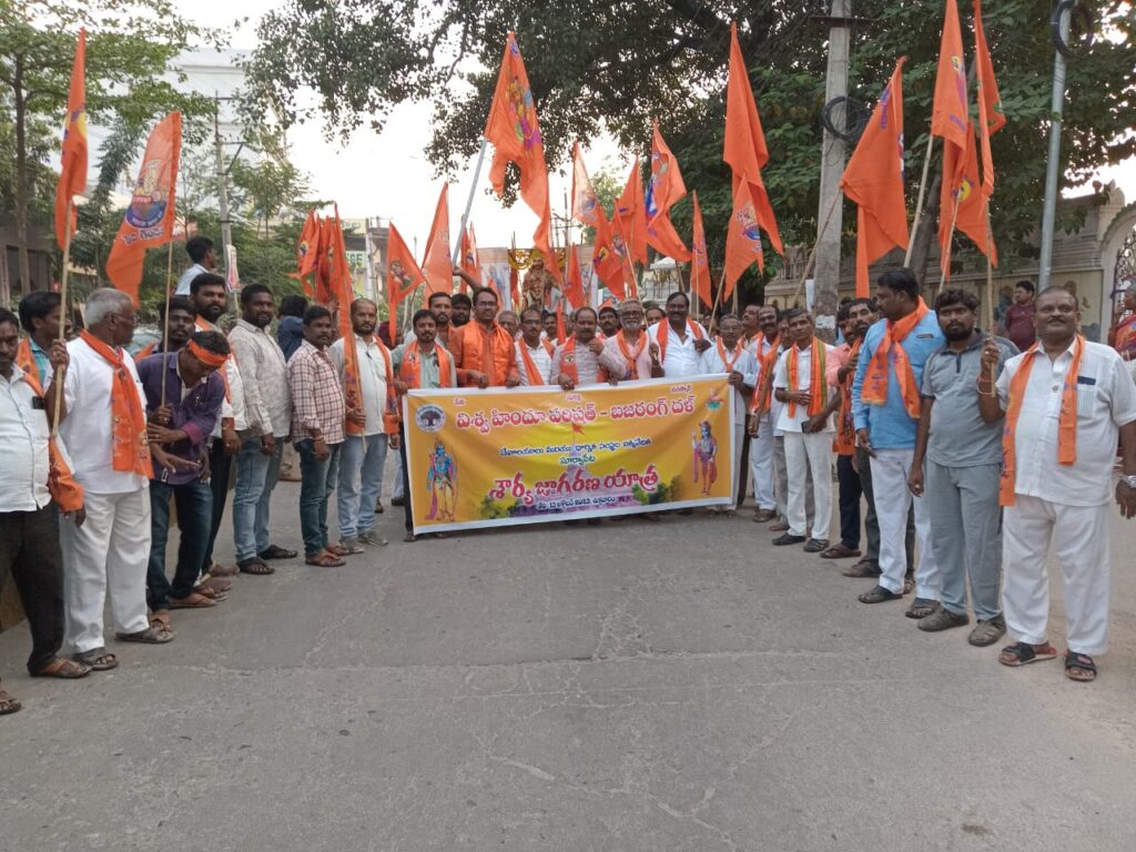 సూర్యాపేట, అక్టోబర్ 13, (అఖండ భూమి) సూర్యాపేటలో యువతను చైతన్యం నింపడం కోసం విశ్వ హిందూ పరిషత్ – బజరంగ్ దళ్ ఆధ్వర్యంలో వెంకటేశ్వర గుడి వద్ద గోరక్ష క్షేత్ర ప్రముఖు తుమురుగోటి యాదగిరి రావు కాషాయ జండా ఊపి యాత్రను ప్రారంభించాడు అనంతరం గుంటి నగేష్ శంఖారాం పూరించి కోలాట భజన బృందాలతో ముందుకు సాగారు ఈ యాత్ర వెంకటేశ్వర గుడి నుండి శంకర్ విలాస్ వాణిజ్య భవన్ టి ఎస్ ఆర్ సెంటర్ పూల సెంటర్ మీదుగా కోర్టు చౌరస్తా నుండి పబ్లిక్ క్లబ్ వరకు చేరుకొని అక్కడ ముగింపు సమావేశం జరిగినది ఈ సమావేశానికి ముఖ్య అతిథులుగా వచ్చిన యాదగిరి రావు మాట్లాడుతూ వచ్చే సంవత్సరం జనవరిలో అయోధ్యలో రామ మందిర నిర్మాణం పూర్తి అయి ప్రారంభోత్సవం జరుగుతున్న సందర్భంగా దేశవ్యాప్తంగా హిందూ బంధువులను యువకులను చైతన్యపరిచేందుకు హిందూ ధర్మ రక్షణకై ప్రచారానికి దేశవ్యాప్తంగా ఈ యొక్క శౌర్య జాగరణ యాత్రలు నిర్వహించడం జరుగుతుందని ఈ దేశాన్ని ప్రపంచంలో విశ్వ గురువుగా అవతరించాలని రామరాజ్యం రావాలని ప్రజలందరూ సంకల్పం తీసుకొని ముందుకు నడవాలని ఈ దేశ రక్షణకై యువతీ యువకులు మేధావులు దేశభక్తులు జాతీయ భావం కలిగిన వారందరూ కూడా పాటుపడాలని కోరారు సూర్యాపేటలో శౌర్య జాగరణ యాత్ర బలప పరాక్రమం కలిగిన హనుమాన్ విగ్రహంతో ఊరేగింపు నిర్వహించడం జరిగింది 2024 జనవరి మూడో వారంలో జరగబోయే అయోధ్య రామ మందిర ప్రారంభోత్సవానికి సన్నాహక కార్యక్రమంగా మరియు విశ్వ హిందూ పరిషత్ 60 సంవత్సరాలు చేరువవుతున్న సందర్భంగా దేశవ్యాప్తంగా విశ్వ హిందూ పరిషత్ – బజరంగ్ దళ్ నిర్వహణలో శౌర్య జాగరణ యాత్రలు జరుగుతున్నాయని తెలియజేశారు. అందులో భాగంగా సూర్యాపేటలో నిర్వహించడం జరిగిందని ఈ దేశం ప్రజలు రామరాజ్యం కావాలని కోరుకుంటున్నారని నేటి యువత రాముని ఆదర్శం తీసుకుని ఈ దేశ సమైక్యత కోసం దేశ భద్రత కోసం అన్నగారిన వర్గాల అభినతికి పాటుపడాలని కోరారు ఈ కార్యక్రమంలో విహెచ్పి జిల్లా గౌరవ అధ్యక్షులు నాగవల్లి బ్రహ్మయ్య ఎక్స్ ఎమ్మెల్యే సంకినేని వెంకటేశ్వరరావు వి.ఐ.పి పట్టణ ప్ర కార్యదర్శి మహేశ్వరo రవిచంద్ర, పర్వతం శ్రీధర్ కుమార్, పసునూరి దినేష్, చింతా వెంకన్న , బైరు విజయ్, కృష్ణ, తండు దేవిక ,చలమల నరసింహ, సలిగంటి వీరేందర్, నాగవెల్లి ప్రభాకర్, తణుకునూరు సంతోష్, తదితరులు పాల్గొన్నారు