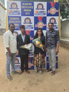 నిజామాబాద్ జిల్లా ప్రతినిధి మనోహర్ ఏప్రిల్: 30 (అఖండ భూమి న్యూస్) ఆర్మూర్ మున్సిపల్ పరిధిలోని మామిడిపల్లి లో గల నలంద హై స్కూల్ లో బుధవారం పదో తరగతి ఫలితాల్లో విద్యార్థులు 100% ఉత్తీర్ణత సాధించగా జక్రాన్ పల్లి మండలం కలిగోట గ్రామానికి చెందిన ఎన్ స్వేజన్ 575/600 సాధించి టాపర్గా నిలిచాడు. వేల్పూర్ మండలం పచ్చల నడుకుడ గ్రామానికి చెందిన విద్యార్థులు భావన రెడ్డి 564.. సంకీర్తన 555.. మామిడిపల్లి కి చెందిన హలీమా 554.. సికింద్రాపూర్ కు చెందిన రక్షిత 546.. భీంగల్ మండలం చేంగల్ గ్రామానికి చెందిన వరుణ్ తేజ్ 542 మార్కులు సాధించి నలంద హై స్కూల్ టాపర్లుగా నిలిచారు. 23 మంది విద్యార్థులు 500కు పైగా మార్కులు సాధించారని నలంద స్కూల్ యాజమాన్యం ప్రసాద్ తెలిపారు.2024-25 అకాడమిక్ ఇయర్లో విద్యార్థులు ప్రతిభను చాటడం సంతోషంగా ఉందన్నారు. విద్యార్థులు ప్రతి సంవత్సరం 100% ఉత్తీర్ణత సాధిస్తూ ఆర్మూర్ మండలంలోని ప్రైవేట్ స్కూల్స్ లలో అత్యధిక మార్కులు సాధించిన విద్యాసంస్థగా నిలవడం గర్వంగా ఉందన్నారు. అనంతరం విద్యార్థులకు శాలువా. పుష్పగుచ్చాలు అందజేసి అభినందించారు. ఈ కార్యక్రమంలో ఉపాధ్యాయులు. విద్యార్థులు. విద్యార్థుల తల్లిదండ్రులు ఉన్నారు.